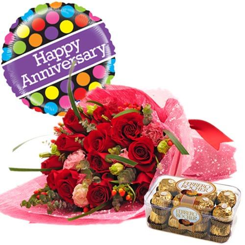 Bouquet of Flowers and a box of Chocolates with Balloon