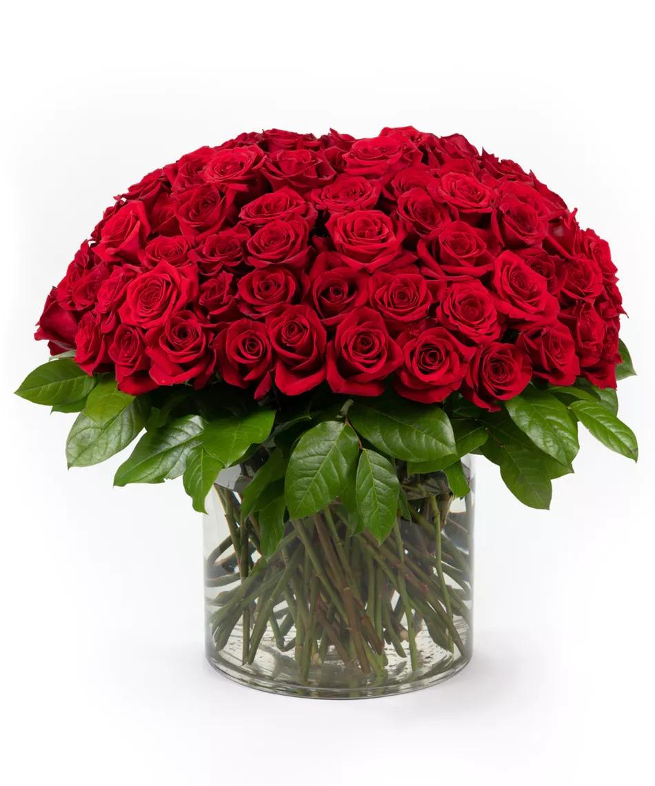 100 red roses in a glass vase