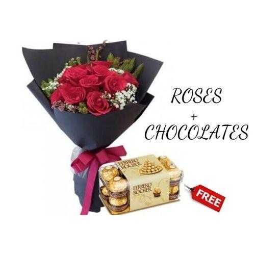 Valentines 12 Red Roses Bouquet with FREE Chocolate box